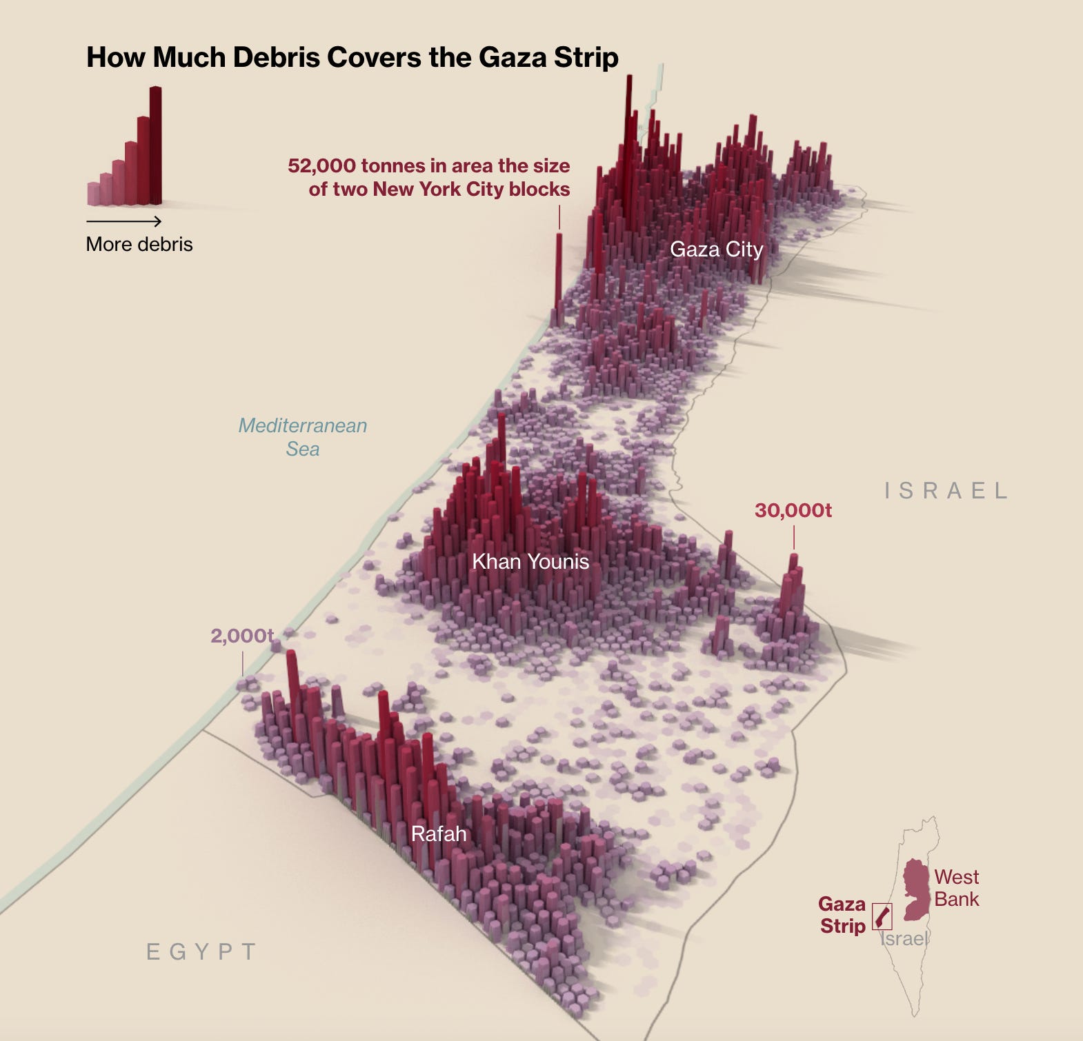 Hasta ahora, los ataques aéreos israelíes han dejado más de 42 millones de toneladas de escombros en toda la Franja, según la ONU. Son escombros suficientes para llenar una hilera de camiones volcadores que se extendería desde Nueva York hasta Singapur. Quitarlos todos puede llevar años y costar hasta 700 millones de dólares. La tarea se complicará por las bombas sin explotar, los contaminantes peligrosos y los restos humanos bajo los escombros. La mayoría de los escombros son viviendas destruidas, y su distribución en la Franja imita aproximadamente la densidad de población de Gaza antes de la guerra.