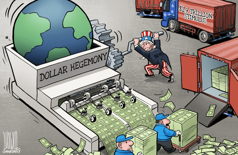 En julio de 1944, por iniciativa de los gobiernos estadounidense y británico, representantes de cuarenta y cuatro países se reunieron en Bretton Woods, New Hampshire, para discutir los planes para el sistema monetario de posguerra. En el curso de la Conferencia de Bretton Woods, se aprobaron los documentos Acta Final de la Conferencia Monetaria y Financiera de las Naciones Unidas , Artículos de Acuerdo del Fondo Monetario Internacional y Artículos de Acuerdo del Banco Internacional de Reconstrucción y Fomento —conocidos colectivamente como los Acuerdos de Bretton Woods—. Un punto clave del sistema de Bretton Woods era construir un orden monetario internacional centrado en el dólar estadounidense. 29 Otras monedas fueron vinculadas al dólar, que a su vez estaba vinculado al oro. El dólar estadounidense comenzó entonces a desempeñar el papel de moneda mundial, reemplazando a la libra esterlina. La ventaja única que se deriva del lugar central del dólar estadounidense en el sistema monetario internacional le da a los EE. UU. una posición especial en comparación con el resto de los países del mundo. El dólar estadounidense representa el 70% de las reservas mundiales de divisas, al tiempo que representa el 68% de las liquidaciones comerciales internacionales, el 80% de las transacciones de divisas y el 90% de las transacciones bancarias internacionales. Como el dólar estadounidense es la moneda de reserva y de liquidación comercial reconocida internacionalmente, Estados Unidos no sólo puede cambiarlo por bienes reales, recursos y mano de obra, y así cubrir su déficit comercial y fiscal de largo plazo, sino que también puede realizar inversiones transfronterizas y fusiones transfronterizas de empresas extranjeras que emplean los dólares estadounidenses que imprime a un costo casi nulo. La hegemonía del dólar estadounidense es un excelente ejemplo de la naturaleza depredadora del neoimperialismo. Estados Unidos también puede obtener señoreaje internacional exportando dólares estadounidenses y puede reducir su deuda externa depreciando el dólar estadounidense o los activos que cotizan en dólares estadounidenses. La hegemonía del dólar estadounidense también ha provocado la transferencia de riqueza de los países deudores a los países acreedores. Esto significa que los países pobres subsidian a los ricos, lo cual es completamente injusto.
