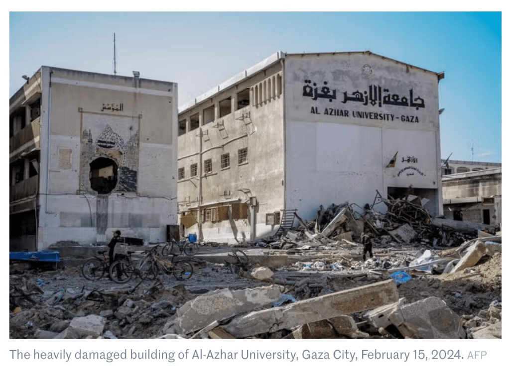 En Gaza, más de la mitad de los edificios han resultado dañados. En la ciudad de Gaza, la proporción supera el 80 por ciento . No es sorprendente que los estragos se extiendan a las 12 universidades de Gaza, todas ellas destruidas total o parcialmente. Al mismo tiempo, la intensidad del fuego y las órdenes de las FDI han desplazado brutalmente a prácticamente toda la población, haciendo imposible que continúe la vida normal. Si la educación y las becas han continuado -y así ha sido- es sólo gracias a la determinación y valentía intrépidas de los profesores y estudiantes palestinos. No sólo los daños al sistema educativo son claramente mucho más amplios que los sufridos en Sudán, o en cualquier otro lugar del mundo, sino que el tipo de redes de comunicaciones que permiten a los investigadores educativos evaluar la escala de los daños en Sudán en términos relativamente precisos ya no existen en Gaza. Es un escenario de ruina total.