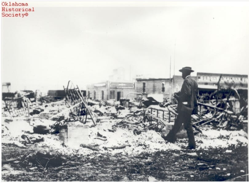 Tulsa, Oklahoma, fue, por supuesto, el escenario de uno de los peores disturbios raciales de Estados Unidos, donde el 31 de mayo y el 1 de junio de 1921, turbas enloquecidas de racistas blancos mataron a hasta trescientas personas negras, mientras que “la segunda comunidad afroamericana más grande del estado… [fue] quemada hasta los cimientos”.