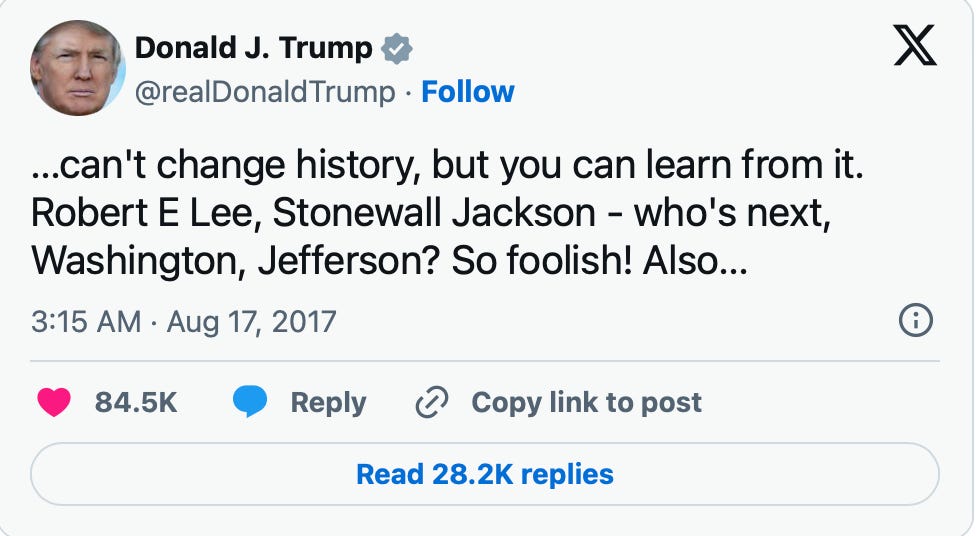 Aquí está Trump tuiteando desde 2017 sobre la eliminación de las estatuas que conmemoran a los “héroes” confederados de la Guerra Civil, Lee y Jackson: