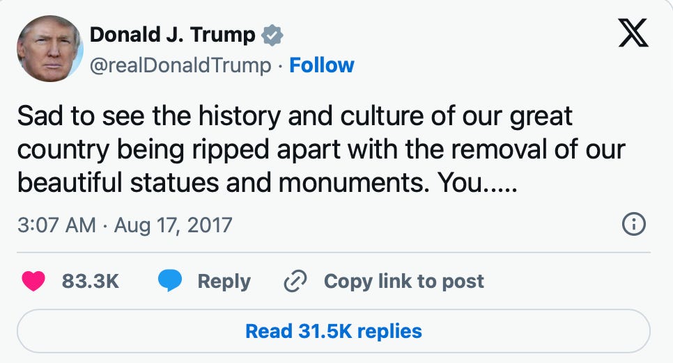 El movimiento para retirar estos monumentos a los héroes militares y políticos de la Confederación logró derribar cientos de estas estatuas y monumentos ofensivos, aunque cientos de ellos aún permanecen, principalmente en el sur de Estados Unidos. Pero fue durante este período que Trump se proclamó defensor de la conmemoración racista.