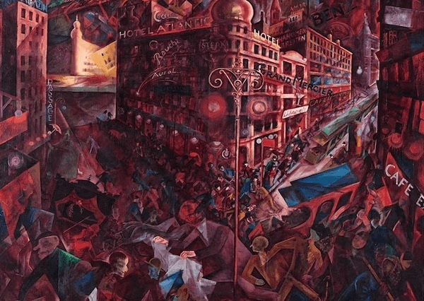Metrópolis (1916-17) de George Grosz se presentó en la exposición Entartete Kunst (arte degenerado) de 1937, organizada por los nazis para desacreditar el arte moderno que consideraban antipatriótico. © Estate of George Grosz, Princeton/Adagp, París, 2024/Museo Nacional Thyssen-Bornemisza, Madrid