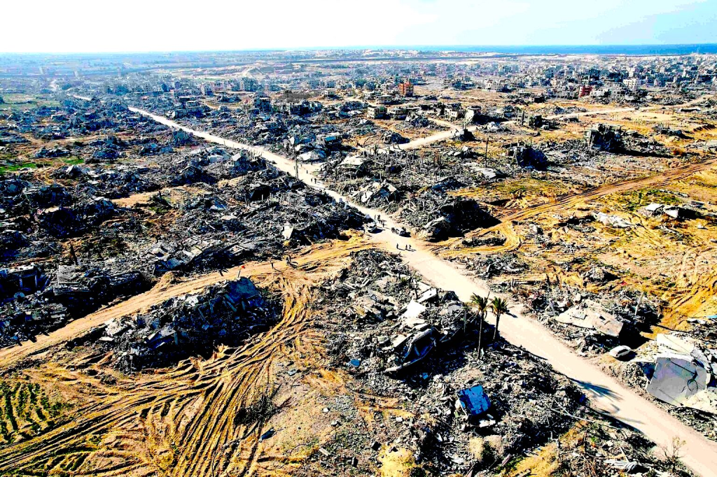 Vista aérea que muestra la destrucción en Rafah, en la Franja de Gaza, tras la retirada de las fuerzas israelíes y al entrar en vigor el alto el fuego, el 21 de enero de 2025. (UNRWA/Wikimedia Commons/CC BY 4.0)