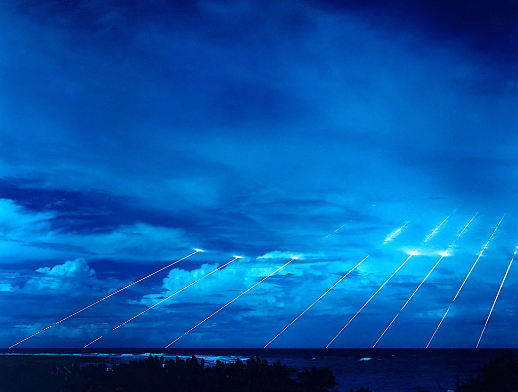 Sistema de misiles LGM-118A Peacekeeper probado en el atolón de Kwajalein, Islas Marshall. Una fotografía de larga exposición muestra las trayectorias de múltiples vehículos de reentrada desplegados por el misil. Un Peacekeeper puede albergar 10 ojivas nucleares, cada una con un objetivo asignado. Las ojivas tendrían una potencia explosiva equivalente a la de 25 armas del tamaño de Hiroshima. (David James Paquin/Ejército de EE. UU./Dominio público)