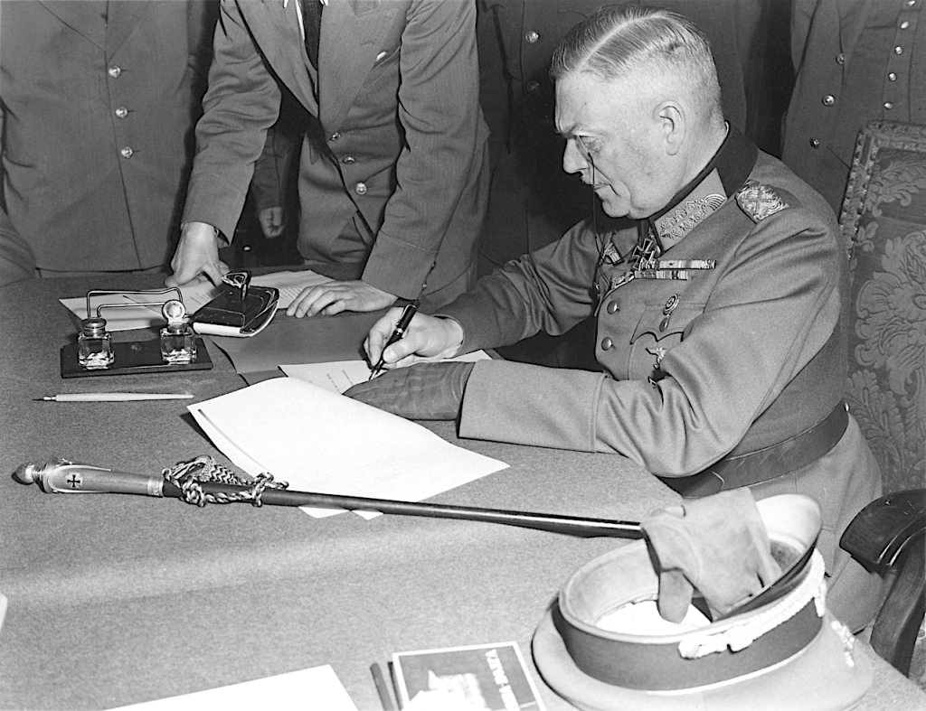 El mariscal de campo Wilhelm Keitel, comandante en jefe de las fuerzas armadas alemanas, firma la rendición incondicional en Karlshorst, Berlín, el 8 de mayo de 1945. (Teniente Moore/Ejército de EE. UU./Administración Nacional de Archivos y Registros)