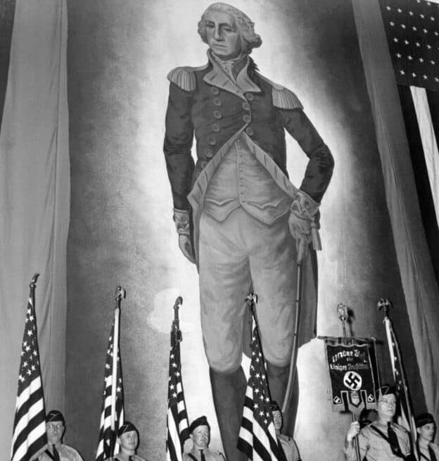 Una guardia de «honor» que sostiene banderas estadounidenses y una pancarta con la esvástica nazi inscrita se encuentra frente a un inmenso retrato de George Washington en la manifestación del German American Bund en el Madison Square Garden, en los años 30 del siglo XX.