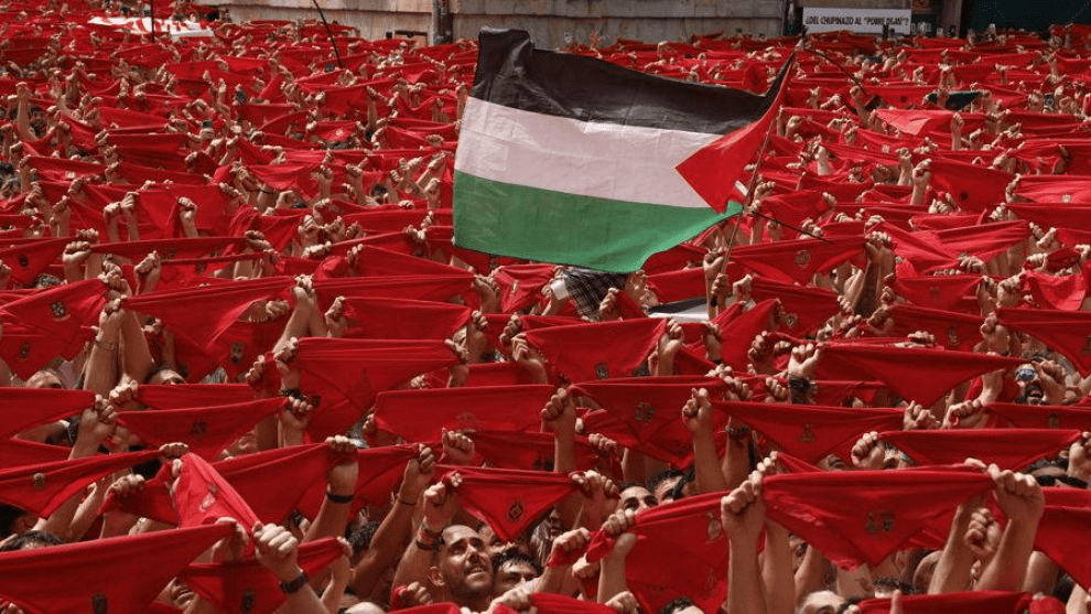 Además de los gritos de «¡Viva San Fermín!» «¡Gora San Fermín!, STOP GENOCIDIO, este año la celebración ha ido acompañada de gritos que decían «¡Palestina libre!».