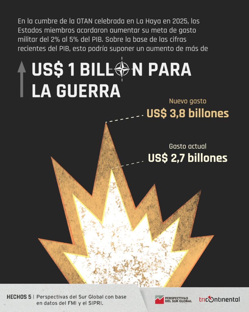 Presionados por Estados Unidos, los Estados miembros de la OTAN acordaron formalmente aumentar su gasto militar al 5 % de su Producto Interno Bruto (PIB) para el año 2035. Considerando que muchos de estos países no han alcanzado siquiera el objetivo previo del 2 %, la medida probablemente desate intensos debates internos dentro de la alianza. Según nuestros cálculos, como muestra el gráfico no 5 de HECHOS, arriba, los países de la OTAN gastan actualmente 2,7 billones de dólares en guerras. Si aumentan su gasto militar al 5 % del PIB, esta cifra ascenderá a 3,8 billones de dólares, es decir, un billón más que en los años anteriores.