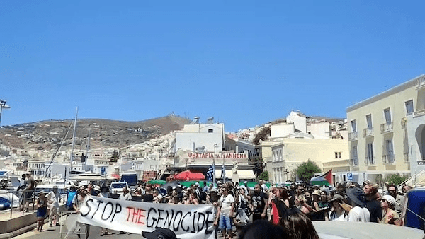 Los pasajeros israelíes de un crucero que llegó a Grecia el 22 de julio no pudieron desembarcar del barco en la isla de Syros debido a una gran multitud de manifestantes pro palestinos que protestaban contra el genocidio israelí de los palestinos en la Franja de Gaza.