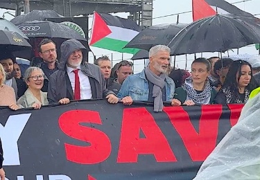 El fundador de Wikileaks , Julian Assange, su esposa Stella y su hermano Gabriel Shipton se unieron a la periodista australiana Mary Kostakidis y, según estimaciones de la policía, a otras 90.000 personas, pero según los organizadores hasta 300.000, para marchar por el Puente del Puerto de Sydney el domingo para exigir el fin del genocidio de Israel en Gaza.
