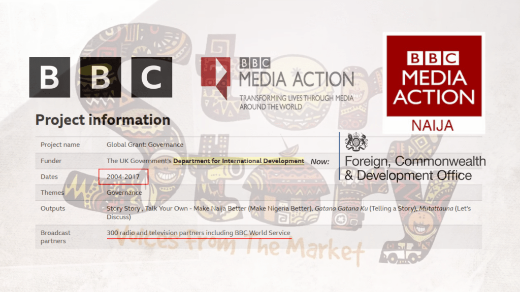 Según documentos internos filtrados publicados por The Grayzone , BBC Media Action se jacta de que el 40 por ciento de los oyentes de un programa de radio llamado “Story Story”, que produjo en Nigeria entre 2004 y 2017, se convencieron de votar de manera diferente simplemente escuchándolo.