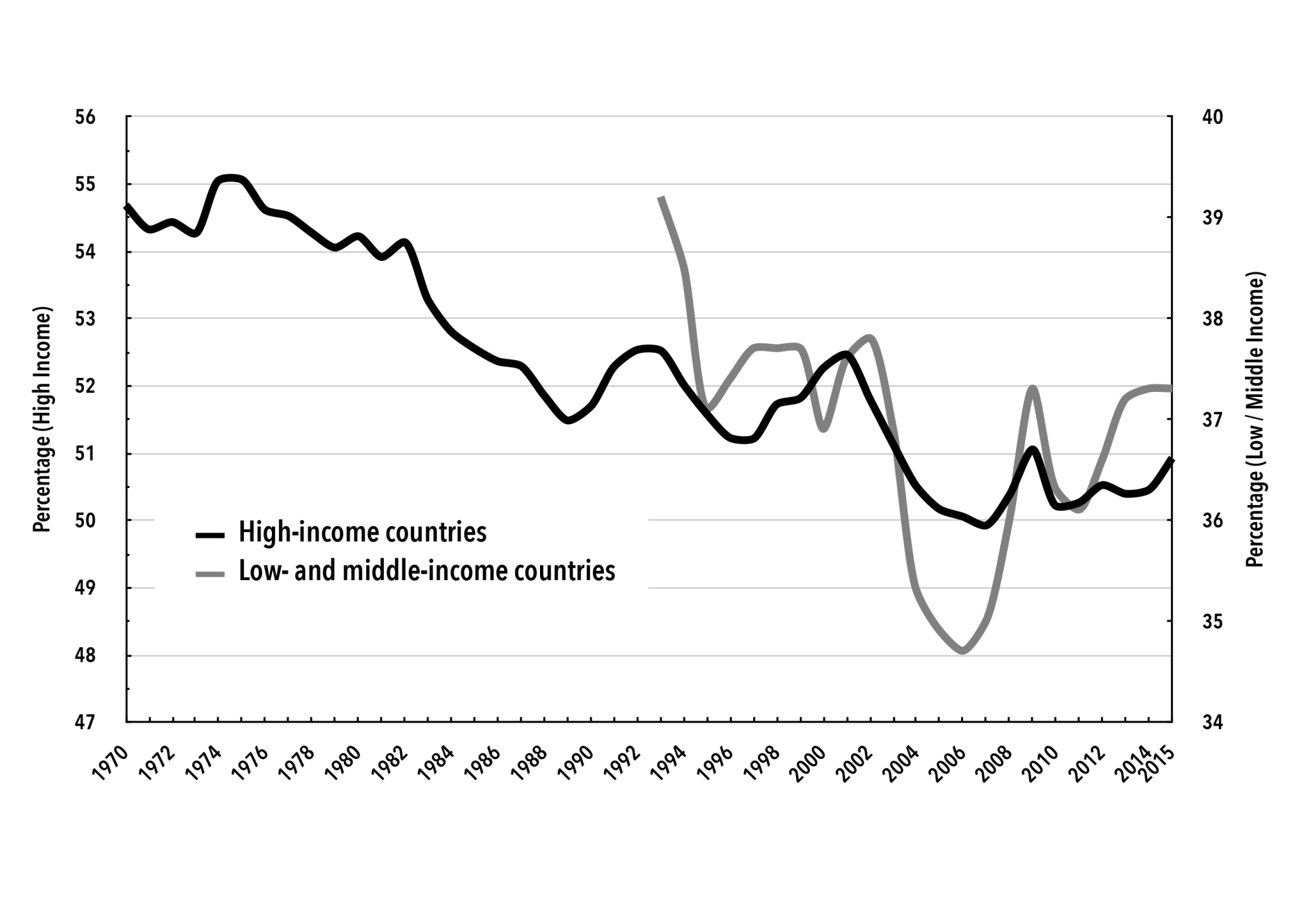 Que el mundo es cada vez más desigual en términos de ingresos, riqueza y acceso a recursos y servicios requiere pocas precisiones. La disminución de la proporción de los ingresos salariales en el total de la renta nacional en casi todas las economías capitalistas ha sido ampliamente observada y documentada. Los trabajos de Engelbert Stockhammer, Thomas Piketty y otros lo han establecido claramente durante el último medio siglo, lo que se confirma con los datos del FMI descritos en el Gráfico 1.7