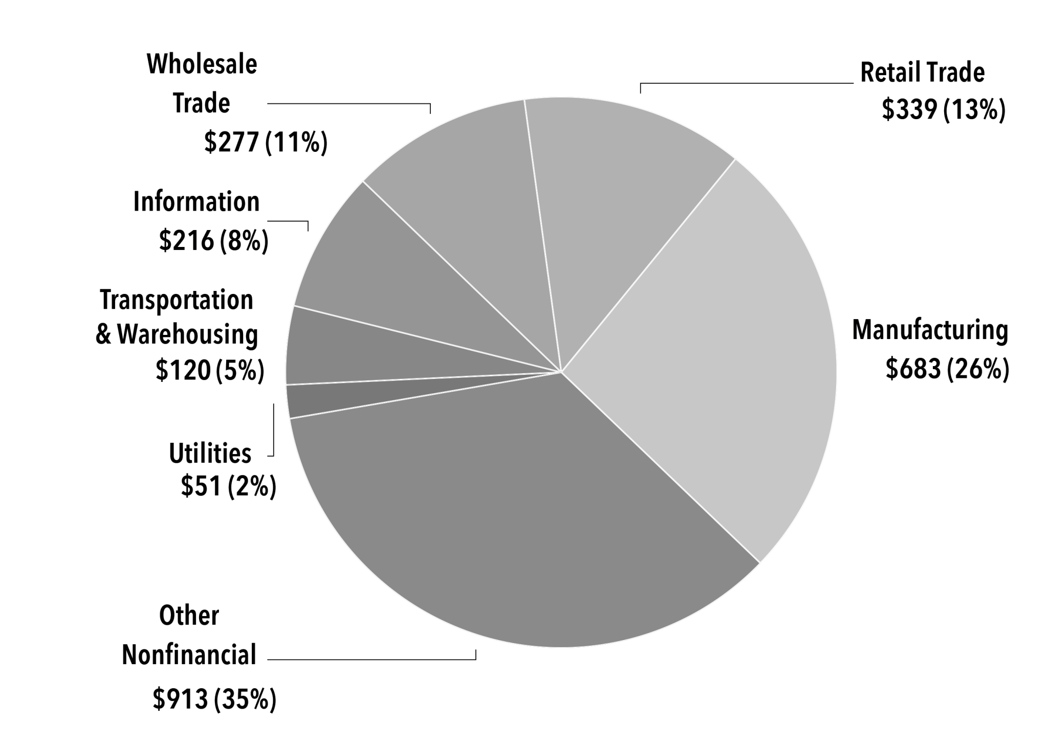 El Gráfico 2 muestra las ganancias totales de todas las corporaciones en Estados Unidos. El aumento de la rentabilidad fue particularmente marcado entre las empresas no financieras, mientras que las ganancias totales de las financieras fluctuaron más y no aumentaron tan drásticamente. Dentro de las empresas no financieras, en el período más reciente de 2022 a 2024, el Gráfico 3 muestra que la mayor parte de las ganancias proviene de la manufactura y el comercio, tanto al por mayor como al por menor. (Cabe destacar que, en el caso del comercio, dado que muchas grandes empresas participan tanto en el comercio al por mayor como al por menor, a menudo es difícil separarlos). En conjunto, estos dos sectores representaron la mitad de las ganancias totales de las empresas en Estados Unidos. Según McKinsey Quarterly , «Las industrias de tecnología y medios de comunicación representaron solo alrededor del 39 % (79 000 millones de dólares) del aumento de las ganancias económicas en Norteamérica [en el período 2015-2019, en comparación con el período 2005-2009]. Los sectores de la industria avanzada (52 000 millones de dólares), la farmacéutica y la tecnología médica (26 000 millones de dólares), la aeronáutica y los viajes (22 000 millones de dólares) y el consumo (15 000 millones de dólares) contribuyeron considerablemente a este repunte. Las telecomunicaciones fueron el único sector importante en Norteamérica en el que las ganancias económicas disminuyeron (-5 000 millones de dólares)».8