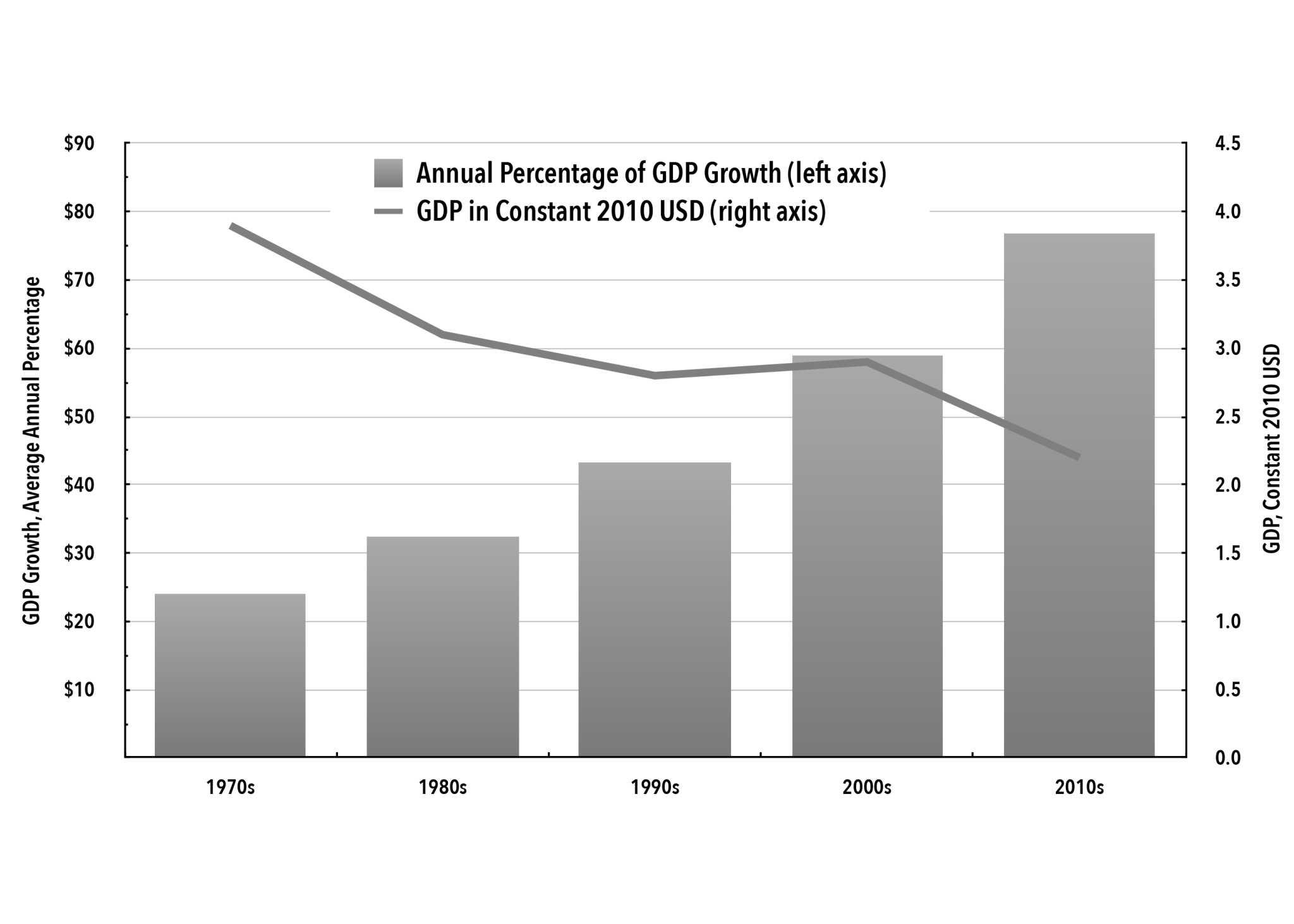 El crecimiento del PIB definitivamente no es un indicador adecuado o realista del progreso humano, ni siquiera del avance puramente material. Pero es necesariamente el objetivo del capitalismo, cuya verdadera razón de ser es aumentar la expansión de la actividad económica comercializada y, por ende, las ganancias. «¡Acumular, acumular! Eso es Moisés y los profetas», como Marx declaró célebremente en el primer volumen de El Capital , viéndolo como la fuerza impulsora del capitalismo en general. Por lo tanto, vale la pena señalar que durante el último medio siglo, el crecimiento del PIB mundial se ha estado desacelerando principalmente (ver Gráfico 4). Mucho antes de la pandemia de COVID-19, el capitalismo global no estaba en buena forma, con una desaceleración del crecimiento, una desaceleración de la inversión y un menor dinamismo en general. En la década posterior a la Crisis Financiera Global, requirió inyecciones masivas de liquidez por parte de los bancos centrales de las economías avanzadas solo para mantenerse a flote. Se empleó ampliamente un soporte vital adicional, en términos de impulsos monetarios y fiscales, en las principales economías avanzadas durante la pandemia de COVID-19, que continuó hasta bien entrados los primeros años de la Guerra de Ucrania.