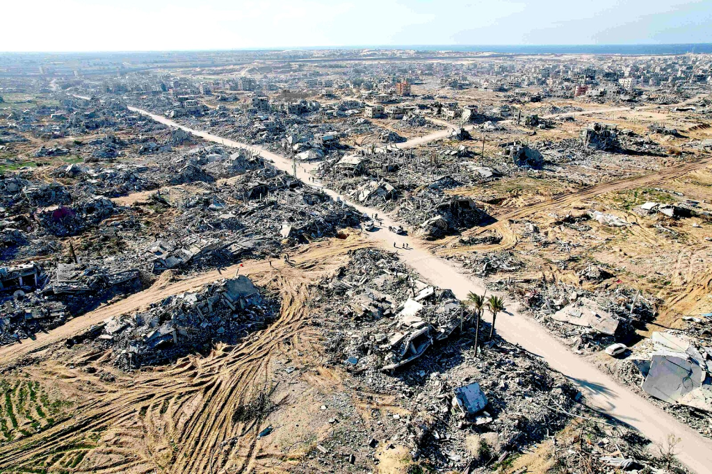 Vista aérea que muestra la destrucción en Rafah, en la Franja de Gaza, tras la retirada de las fuerzas israelíes y la entrada en vigor de un alto el fuego temporal, el 21 de enero de 2025. (UNRWA/Wikimedia Commons/CC BY 4.0)