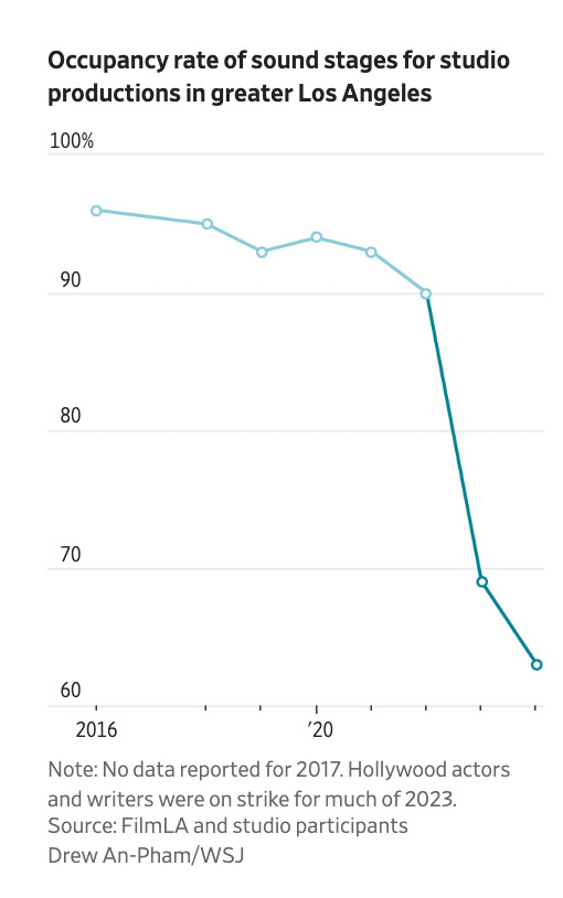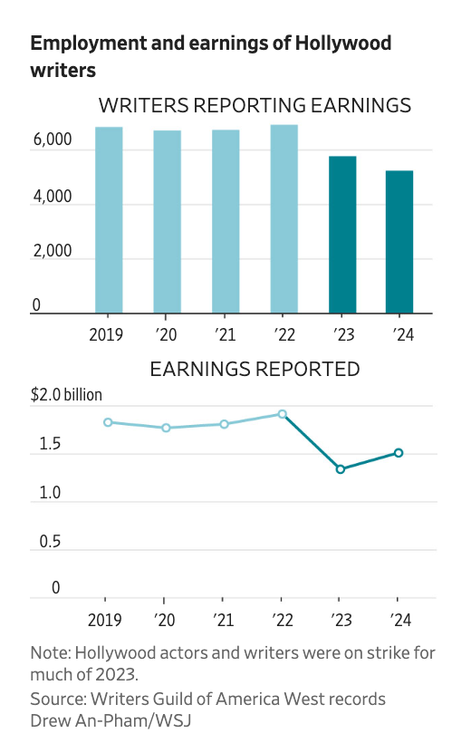 La producción televisiva experimentó un auge en la década de 2010 y principios de la de 2020, cuando las empresas intentaron impulsar los servicios de streaming. Sin embargo, en 2022, los inversores observaron una desaceleración del crecimiento del streaming y decidieron que lo que realmente importa es la rentabilidad. A finales de 2024, unas 100.000 personas trabajaban en la industria cinematográfica del condado de Los Ángeles, según la Oficina de Estadísticas Laborales. Dos años antes, eran 142.000.