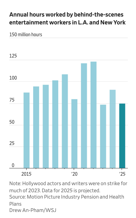 La producción televisiva experimentó un auge en la década de 2010 y principios de la de 2020, cuando las empresas intentaron impulsar los servicios de streaming. Sin embargo, en 2022, los inversores observaron una desaceleración del crecimiento del streaming y decidieron que lo que realmente importa es la rentabilidad. A finales de 2024, unas 100.000 personas trabajaban en la industria cinematográfica del condado de Los Ángeles, según la Oficina de Estadísticas Laborales. Dos años antes, eran 142.000.
