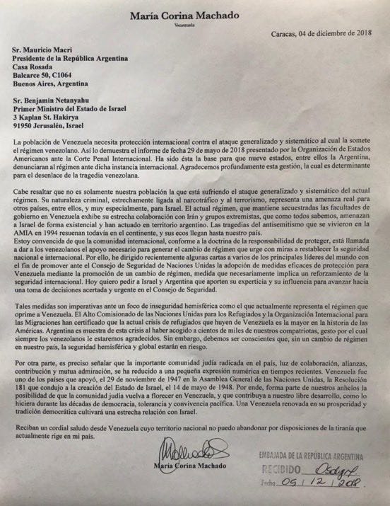 Arriba: La famosa carta de María Corina Machado a Netanyahu rogándole que invada Venezuela