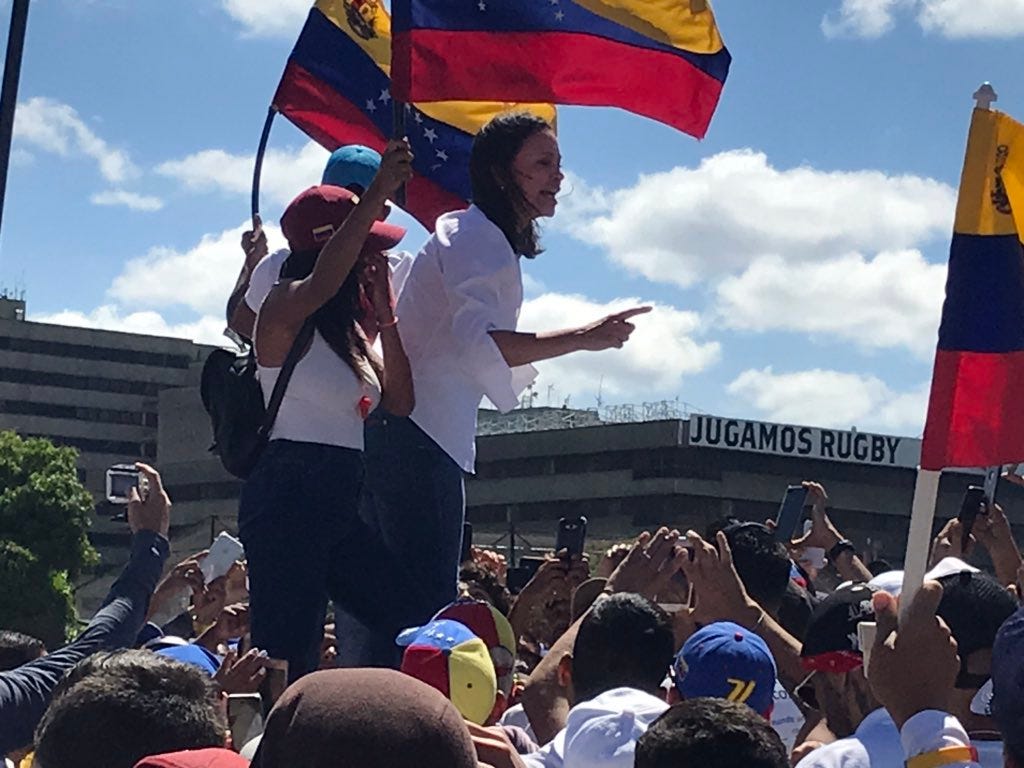 Arriba: Machado intenta incitar a la oposición venezolana de clase alta a tomar el control de la Base Aérea Carlota en Caracas, el 23 de febrero de 2019 (foto de Max Blumenthal)