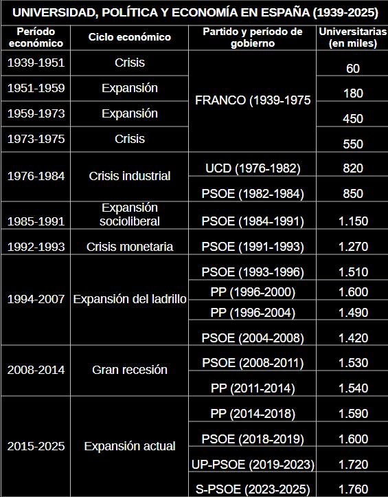 De una pasada, hay que mirar desde la universidad de élites del franquismo, régimen en el que también asoma la universidad de masas que luego se expandiría durante la transición democrática, hasta el más reciente modelo diferenciado (público-privado, rentas altas-medias, territorios, titulaciones, etc.). El gráfico de las matriculaciones universitarias es revelador.