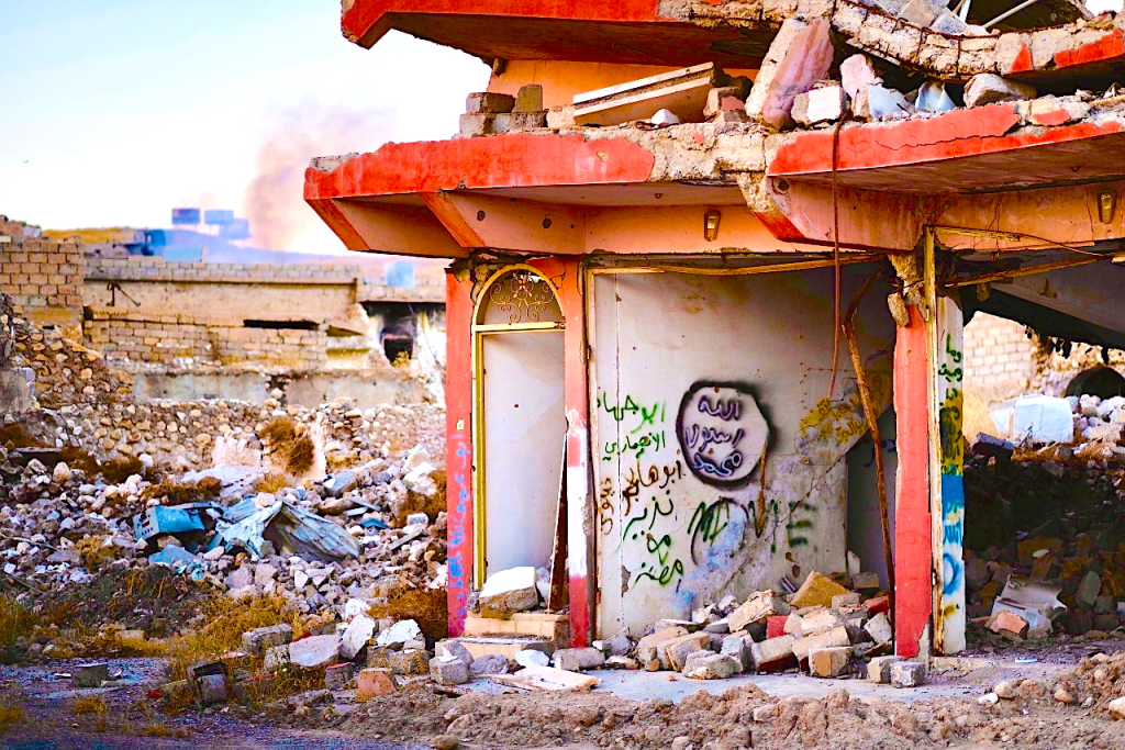 Grafitis del Estado Islámico en las ruinas de Sinjar en julio de 2019, tras la guerra con el Estado Islámico. (Levi Clancy/ Wikimedia Commons/ CC0 1.0)