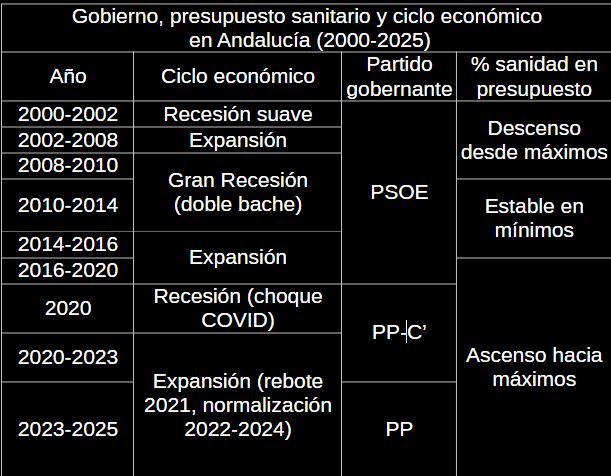 La sanidad pública andaluza, como actividad a cargo del presupuesto público está sujeta a sus determinaciones: así cuando toca recortes públicos, la sanidad es una candidata, y cuando toca impulsar la actividad económica, también.