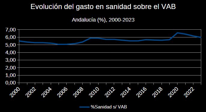 El esfuerzo económico que la sociedad andaluza está dispuesta a realizar nos lo muestra el porcentaje del gasto sanitario (público y de los hogares) como porcentaje del total de la producción regional (valor añadido bruto). Vemos, además de la estabilidad, como este esfuerzo aumenta en las crisis (Gran Recesión, COVID) y se reduce en las expansiones.
