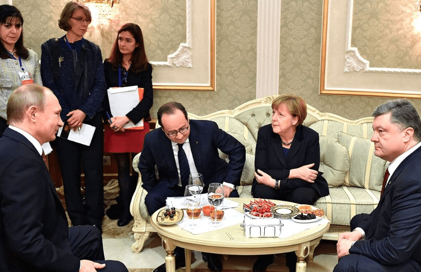 12 de febrero de 2015: El presidente ruso, Vladímir Putin; el presidente francés, François Hollande; la canciller alemana, Angela Merkel; y el presidente ucraniano, Petró Poroshenko, en las conversaciones del formato de Normandía en Minsk, Bielorrusia. (Kremlin)