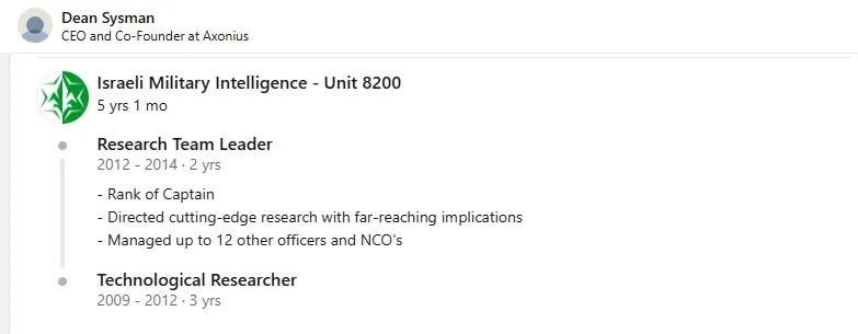 Axonius fue fundada y actualmente está dirigida por los israelíes Dean Sysman, Ofri Shur y Avidor Bartov, quienes se conocieron en la década de 2010 mientras trabajaban en el mismo equipo dentro del servicio de espionaje israelí Unidad 8200. En su perfil de LinkedIn, Sysman ofrece pocos detalles de su trabajo para las Fuerzas de Defensa de Israel (FDI), describiéndolo simplemente como de «implicaciones de gran alcance».