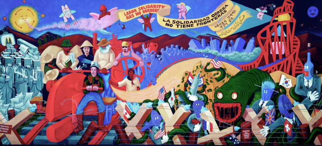 «La solidaridad laboral no tiene fronteras». Este mural de Mike Alewitz se pintó en Los Ángeles en 1992 para defender los derechos de los trabajadores inmigrantes. El monstruo verde, «el monstruo verde del capitalismo», también se vio en un mural de 1985 para los huelguistas de Hormel, pintado por el mismo artista.