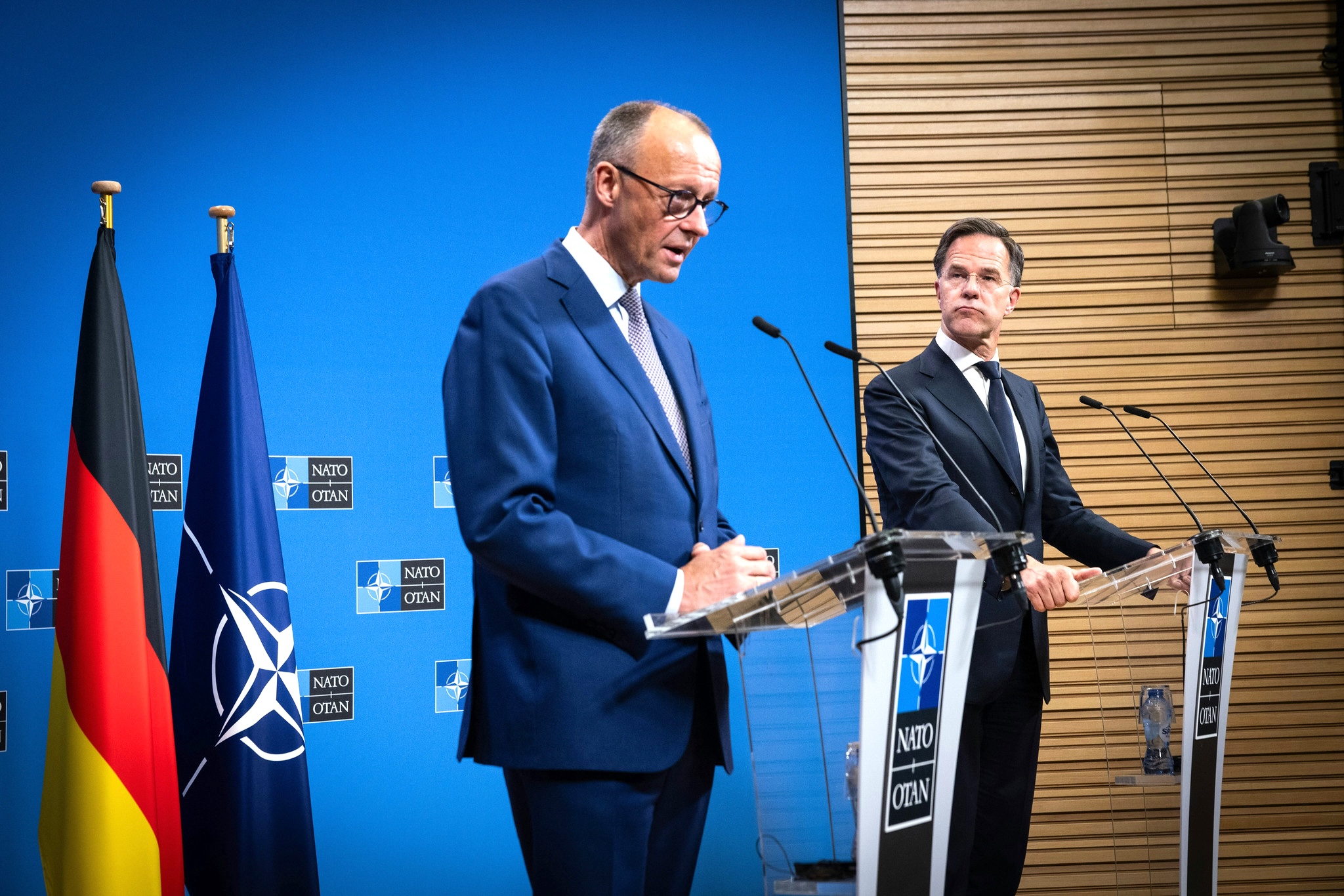 El canciller alemán, Friedrich Merz, con el secretario general de la OTAN, Mark Rutte, en la sede de la alianza en Bruselas en mayo de 2025. (NATO/Flickr/CC BY-NC-ND 2.0)