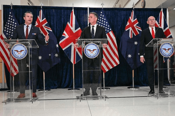En una reunión en el Pentágono el 10 de diciembre, el Secretario de Guerra de Estados Unidos, Pete Hegseth, y sus homólogos de Australia y Gran Bretaña se comprometieron a avanzar “a toda máquina” con AUKUS, un pacto militar trilateral mediante el cual Estados Unidos está convirtiendo a Australia en una base de operaciones avanzada y un centro de submarinos nucleares para una posible guerra contra China.