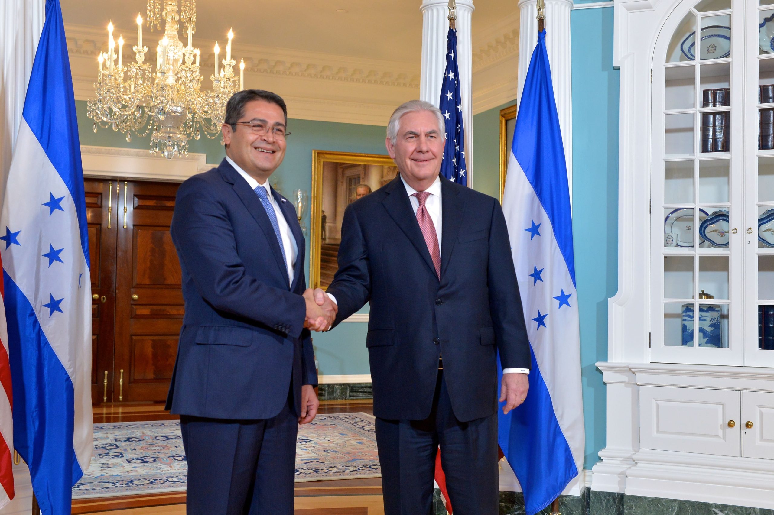 El presidente hondureño, Juan Orlando Hernández, con el secretario de Estado de EE. UU., Rex Tillerson, en el Departamento de Estado en marzo de 2017. (Departamento de Estado/Dominio público)