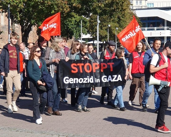 En septiembre, cuatro diputados de Die Linke fueron expulsados del Bundestag por ondear una bandera palestina . Ese mismo mes, el partido coorganizó la mayor manifestación por Palestina en la historia de Alemania . Sobre esa manifestación, la copresidenta del partido, Inés Schwerdtner, declaró : «Estamos aquí en nombre de todo el partido cuando decimos: hemos guardado silencio durante demasiado tiempo. He guardado silencio durante demasiado tiempo. ¡Es un genocidio! Debemos detener el suministro de armas».