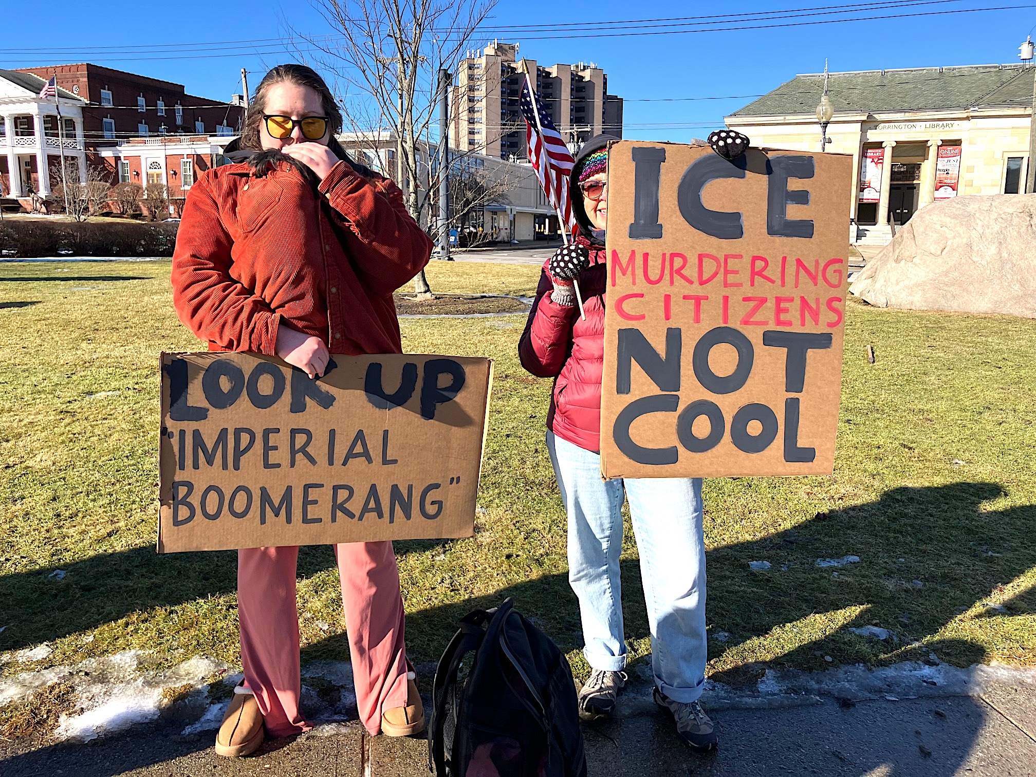 Fui a una de estas manifestaciones aquí el domingo por la mañana. Hubo una buena asistencia en la plaza del pueblo. Me complace ser miembro de un grupo estatal llamado «ICE Fuera para Siempre», un juego de palabras brillante y compasivo que abre la mente al comprender el significado de la frase.
