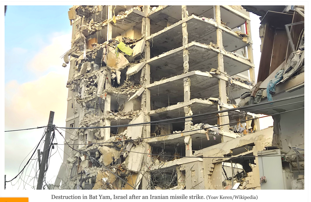 Secuelas el 17 de junio de 2025 de un ataque con misiles iraníes en Ramat Gan en el distrito israelí de Tel Aviv. (Yoram Sorek/Wikimedia Commons/CC0)