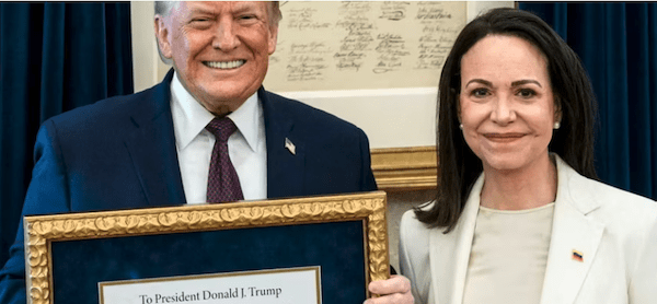 A pesar de haber sido ignorada por Trump para asumir cualquier puesto de liderazgo en Venezuela hasta el momento, Machado le entregó a Trump su medalla Nobel enmarcada junto con un certificado de agradecimiento durante una reunión el jueves en la Casa Blanca . Trump publicó posteriormente en su red social Truth: «María me entregó su Premio Nobel de la Paz por el trabajo que he realizado. Un gesto maravilloso de respeto mutuo».