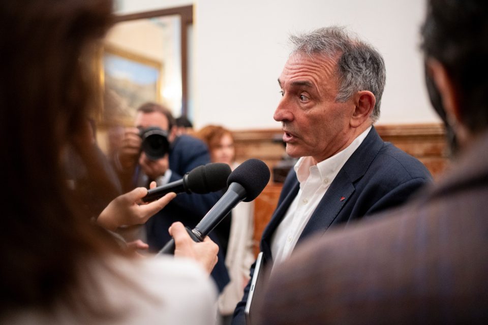 Enrique Santiago (Izquierda Unida) respondiendo preguntas a medios.