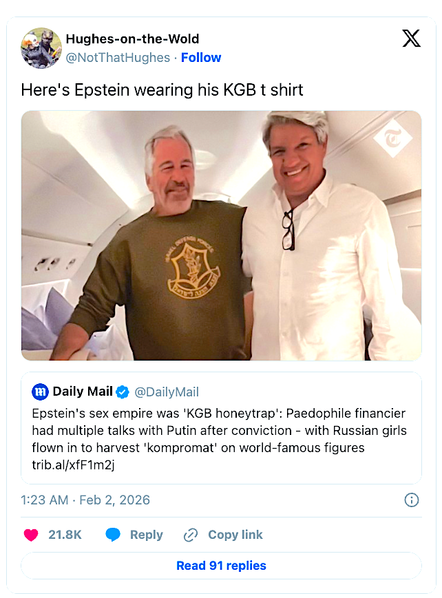 Un nuevo artículo del Daily Mail lleva por título: “El imperio sexual de Epstein era una ‘trampa de miel de la KGB’: un financista pedófilo tuvo múltiples conversaciones con Putin después de su condena, y chicas rusas volaron para cosechar ‘kompromat’ de figuras mundialmente famosas”.