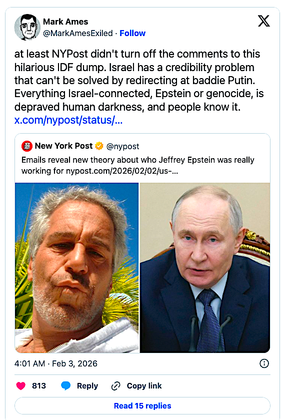 Los documentos de Epstein llevan meses confirmando que era, clara e innegablemente, un agente de la inteligencia israelí, algo que la última ronda de publicaciones ha reforzado considerablemente . Por lo tanto, es natural que los medios occidentales difundan la historia de que Epstein trabajaba para Vladimir Putin.