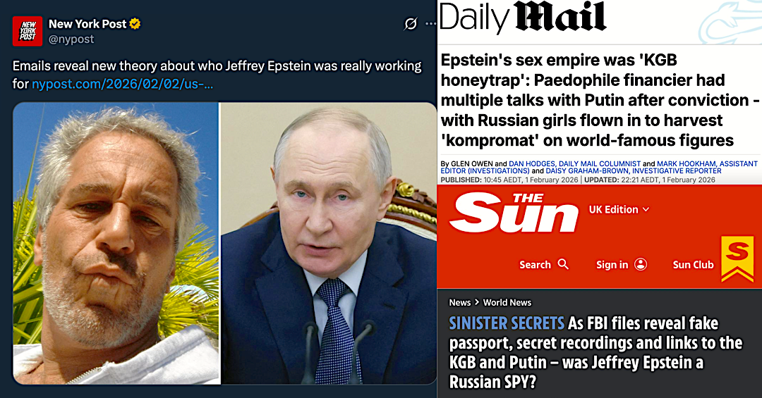 “ Los correos electrónicos revelan una nueva teoría sobre para quién trabajaba realmente Jeffrey Epstein ”, se lee en un titular del New York Post de Murdoch, con el autor Anthony Blair escribiendo que “Los correos electrónicos que muestran fuentes anónimas discutiendo reuniones entre Epstein y el presidente ruso están generando preguntas sobre si la deshonrada figura de Wall Street puede haber traficado con niñas de Rusia en un esfuerzo respaldado por el estado para ejecutar la ‘trampa de miel más grande del mundo’ para atrapar a los ricos y poderosos”.