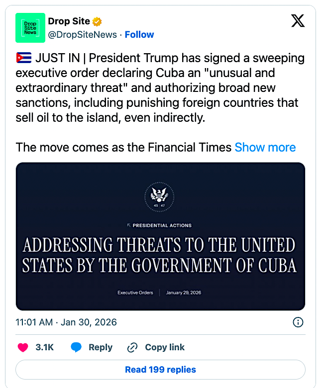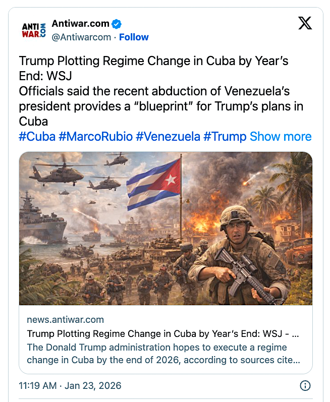 Es increíble la rapidez y agresividad con la que Estados Unidos impulsa sus arraigadas agendas de conquista global bajo la administración Trump. Ahora se apresuran a arrancar con Cuba.