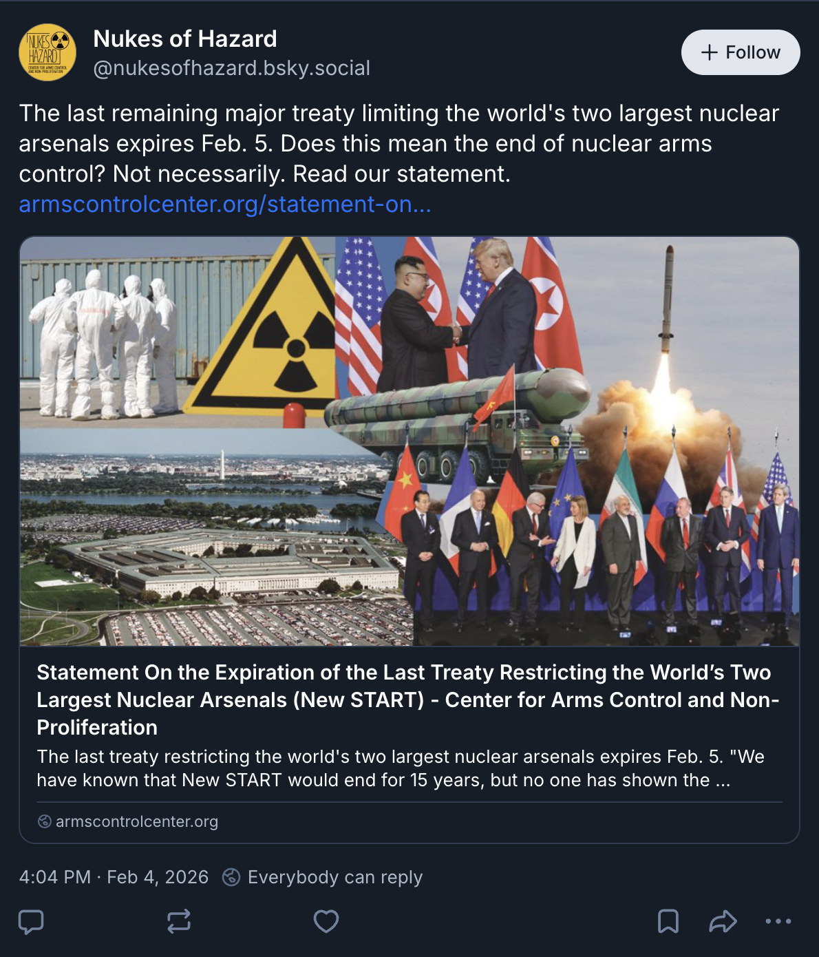 La semana pasada, el Boletín de la Junta de Ciencia y Seguridad de los Científicos Atómicos adelantó su simbólico Reloj del Juicio Final a 85 segundos antes de la medianoche, lo más cerca que ha estado jamás de la aniquilación termonuclear global, citando acontecimientos que incluyen la imposibilidad de extender el Nuevo START, el creciente arsenal de China y las pruebas de armas rusas, a las que Trump ha prometido responder de la misma manera.
