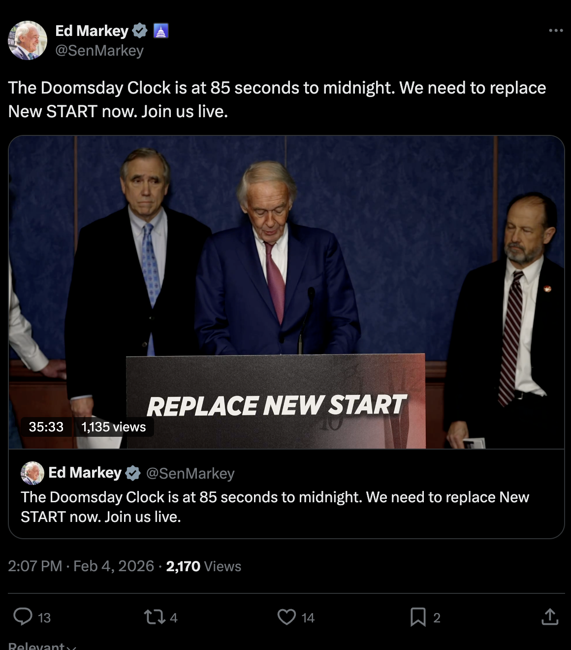 “El Reloj del Juicio Final está a 85 segundos de la medianoche”, dijo Markey, copresidente del Grupo de Trabajo sobre Armas Nucleares y Control de Armamentos del Congreso. “Necesitamos reemplazar el Nuevo START ya”.