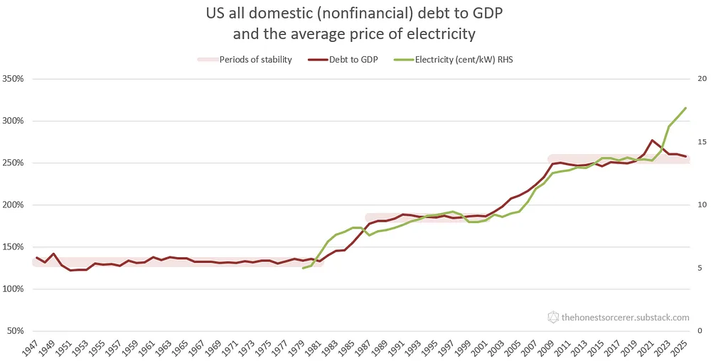 Las economías occidentales han llegado a un punto muerto. Un punto de inflexión más allá del cual ya no es viable seguir aumentando los niveles de deuda, a pesar de que una economía en desaceleración clama por más inversión. El inicio de un largo y prolongado declive económico parece ahora inevitable, incluso para aquellos que solo siguen las métricas oficiales del PIB. Sin embargo, al observar los indicadores económicos del mundo real, como el precio de la electricidad o la ratio de la deuda interna total (privada y pública) con respecto al PIB, el panorama se vuelve muy claro. En términos sencillos: cada vez que subía el coste de la electricidad, la economía estadounidense se endeudaba más y más. No es de extrañar: la energía es la economía, el dinero no es más que un derecho sobre la energía. Todas las actividades económicas, desde la minería hasta la fabricación, o desde los servicios hasta el comercio, requieren primero el gasto de energía (y no solo electricidad).Sin energía eléctrica o combustibles líquidos, la economía se paralizaría y los economistas se quedarían sentados en la oscuridad contando dinero ficticio. Las deudas pendientes son, por lo tanto, un derecho sobre el uso futuro de la energía: representan la cantidad de combustible que tenemos que quemar y los kilovatios de electricidad que tenemos que consumir para ganar el dinero con el que podemos saldar nuestras deudas. De ahí la estrecha correlación.