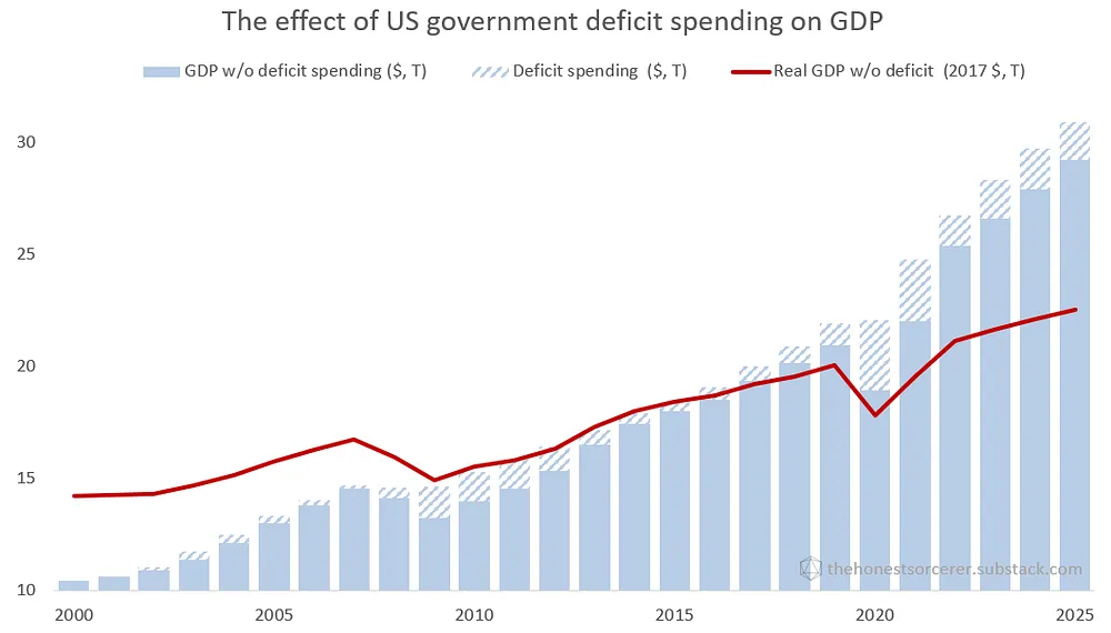 Sin embargo, la deuda privada y pública ya ha alcanzado un nivel en el que los pagos de intereses se llevan entre el 8 % y el 10 % del producto interior bruto, y en el que los prestatarios ya tienen dificultades para seguir pagando sus deudas. El sistema se ha vuelto totalmente insostenible, incapaz de asumir más deuda, pero, al mismo tiempo, incapaz de vivir sin ella. La economía ha entrado en un círculo vicioso en el que el aumento de los precios y el estancamiento de los salarios obligan a los hogares, las empresas y el gobierno a solicitar más créditos, lo que a su vez crea más dinero, lo que alimenta otra ronda de inflación, seguida de otra ronda de aumento de la deuda. Lo que es peor, y debido principalmente a la difícil situación de la productividad en la extracción de materias primas y la producción de energía, la economía se ha vuelto totalmente adicta al gasto público deficitario, lo que ha dado lugar a cifras de crecimiento del PIB artificialmente infladas. Sin este enorme gasto deficitario, y utilizando dólares de 2017 (ajustados a la inflación) para medir el crecimiento real del PIB, la economía estadounidense apenas habría crecido en el último cuarto de siglo. Parece que los gobiernos de los últimos 25 años han hecho todo lo posible para a) ocultar la verdadera profundidad de cada recesión y b) mostrar un crecimiento del PIB superior al normal… Y si la inflación fuera solo 2 puntos porcentuales más alta cada año (que la cifra oficial utilizada para calcular los dólares reales de 2017), todo este crecimiento sería cero. (Más información: El fin del decrecimiento).