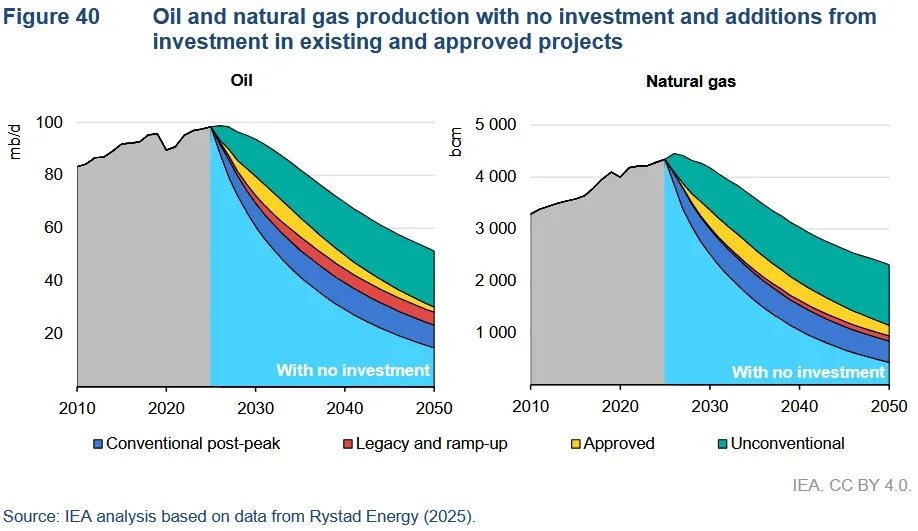 Además del aumento de los costes energéticos de la extracción, un informe de la AIE publicado recientemente ha revelado que las tasas de agotamiento natural son mucho más altas de lo esperado. Según las conclusiones del informe, a medida que los yacimientos petrolíferos envejecen, el agotamiento se acelera, especialmente en el caso de los recursos no convencionales (por ejemplo, el petróleo de esquisto o de formaciones compactas), que tienden a disminuir aún más rápidamente. Con la disminución de los beneficios, el estancamiento de la demanda y el aumento de los costes operativos, no es difícil ver cómo el incentivo para combatir este declive acelerado acabará desapareciendo poco a poco. Como se desprende de un resumen reciente de RystadEnergy: «Durante las próximas décadas, es probable que no se disponga del capital necesario para satisfacer la demanda de petróleo en continuo aumento, los precios de los servicios podrían dispararse y es probable que haya un interés limitado por las innovaciones que permitan mantener unas emisiones tan elevadas procedentes del petróleo». Sin embargo, sin una inversión cada vez mayor en los yacimientos existentes y nuevos, el agotamiento simplemente se impondrá y lo más probable es que provoque un descenso de la producción mundial de petróleo, como se observa en el gráfico siguiente.