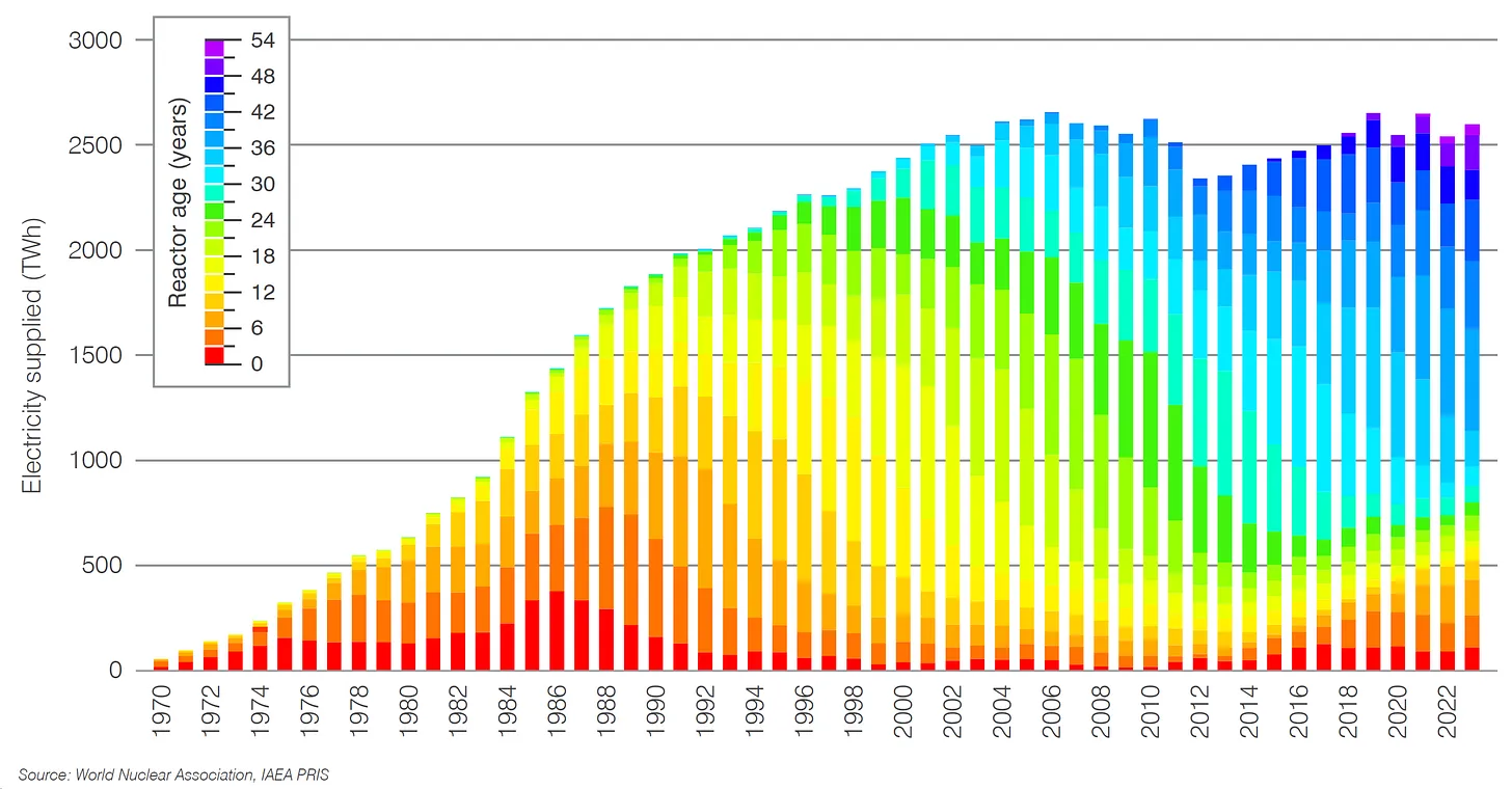 La causa inmediata de ello es el envejecimiento del parque de reactores nucleares mundial. La mayoría de los reactores se construyeron en los años sesenta y setenta, cuando las industrias manufactureras y el rendimiento energético de las inversiones eran mucho más saludables. Las centrales nucleares requieren mucho hormigón, acero, una economía industrial sólida y, en última instancia, combustible de diesel para su construcción y mantenimiento, además de la extracción y el procesamiento de mineral de uranio para combustible. Por eso, cambiar al torio o incluso a la fusión tampoco sería una solución, ya que todas estas nuevas tecnologías tan promocionadas nos dejarían igualmente expuestos a los problemas de la minería, el transporte y el colapso del ecosistema industrial mencionados anteriormente. Lo que vemos es un fallo sistémico, no la falta de un componente.