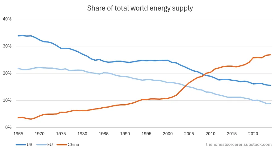 En lugar de una transición energética imaginaria y técnicamente inviable, el verdadero cambio de poder se produce entre las economías. En realidad, no es nada complicado: quienes consumen más combustibles fósiles y electricidad producen más productos, más alimentos, más armas y transportan a más personas y mercancías. Quienes no lo hacen, se quedan atrás y, al final, serán superados por la competencia. Según la Oficina Nacional de Estadísticas de China, en 2024, la producción industrial total con valor añadido de China alcanzó los 5,65 billones de dólares, mientras que la de Estados Unidos se situó en 3,35 billones de dólares. Más energía, mayor economía. (De hecho, el crecimiento de la producción industrial estadounidense se detuvo ya en 2008 y se ha estancado desde entonces, mientras que Asia no ha dejado de ampliar su capacidad desde entonces). Pero China está repitiendo el mismo error fundamental que cometió Occidente al suponer que el crecimiento económico y el consumo de energía podrían continuar para siempre. En la década de 1960, Europa y Estados Unidos dominaban el panorama económico mundial, con una cuota combinada del 55 % de la energía mundial suministrada a sus industrias y población. China superó primero a Europa a principios de la década de 2000 y luego a Estados Unidos en 2009. Ahora tiene una cuota absolutamente dominante del consumo energético mundial, superando al conjunto de Occidente por un margen cada vez mayor. Salvo que se produzca un intercambio termonuclear, no hay forma de que esta tendencia se invierta.